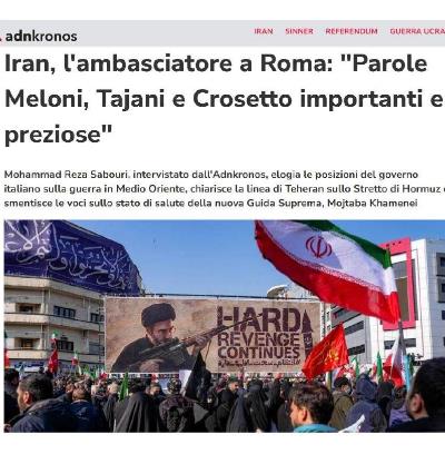 Le dichiarazioni del ministro della Difesa italiano sul carattere illegale e illegittimo dell’aggressione di Stati Uniti e Israele, la condanna dell’uccisione di bambini innocenti nella scuola di Minab da parte della signora Meloni, primo ministro italiano, e l’annuncio del ministro degli Esteri italiano di non aderire alla coalizione proposta da Trump riguardo allo Stretto di Hormuz sono molto importanti e preziosi. Purtroppo, tuttavia, assistiamo anche a dichiarazioni contraddittorie da parte di alcuni altri funzionari, che spero vengano presto corrette grazie a una migliore comprensione della realtà. In ogni caso, per noi le posizioni del popolo italiano sono molto importanti. In questi giorni e in queste notti ricevo numerosi messaggi da parte di cittadini italiani. Le molte manifestazioni contro la guerra organizzate in varie parti d’Italia lo dimostrano. Le persone esprimono il loro odio verso l’aggressione, la guerra e le uccisioni. Questi sentimenti autentici hanno per noi un grande valore. Gli iraniani, storicamente, considerano amici veri coloro che restano tali nei momenti difficili. A mio avviso, il popolo italiano è un vero amico dell’Iran.