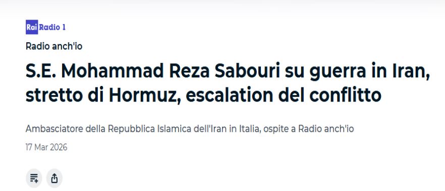 Iran e Italia, come due nazioni civili e ricche di cultura, hanno legami storici; per noi è preziosa la consapevolezza dell’opinione pubblica italiana riguardo alle cause dell’attuale guerra, conseguente all’aggressione contro l’Iran. Nella cultura iraniana, gli amici si riconoscono nei momenti difficili.